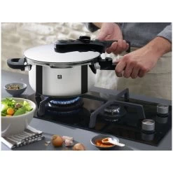 In dem Schnellkochtopf aus der Serie ZWILLING® EcoQuick II gelingen Ihnen Gerichte nicht nur schnell, sondern auch mühelos. Aufgrund der Möglichkeit, zwischen zwei Druckstufen auszuwählen, lassen sich in diesem Topf sowohl Fisch und Gemüse als auch unempfindlichere Gerichte wie Eintöpfe oder Fleisch zubereiten. Dank seines Fassungsvermögens von 3 l bietet der Schnellkochtopf auch Platz für kleinere Portionen für die ganze Familie oder Gäste. Das Prinzip des Schnellkochtopfs basiert darauf, dass er besonders fest verschließbar ist. Der Druckaufbau im Innern ermöglicht das effektive Garen mit hohen Temperaturen. Die im Schnellkochtopf zubereiteten Gerichte behalten ihre natürlichen Aromen und den Großteil ihrer Nährstoffe bei einem gleichzeitig niedrigen Energieverbrauch. Er ist aus poliertem, kratzfestem 18/10-Edelstahl gefertigt und auf allen Herdarten einsetzbar. Mit dem passenden Zubehör können Sie in diesem Topf schmoren, dämpfen, frittieren, anbraten und kochen. Die Einsätze sind separat erhältlich. Der SIGMA Classic Sandwichboden mit einem Kern aus Aluminium sorgt für eine optimale Verteilung der Wärme im Schnellkochtopf. Da der Stiel des Topfes aus hitzebeständigem Kunststoff besteht, bleibt er während des Garvorgangs kühl. Zudem befindet sich am Griff ein Regler, mit dem Sie zwischen der Schon- und der Schnellstufe wählen können. Mit dem Schnellkochtopf von ZWILLING® erhalten Sie einen effizienten und innovativen Topf, in dem Sie auch anspruchsvolle Gerichte mühelos, energiesparend und schnell zubereiten.