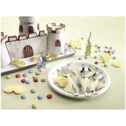Ein sanfter Drachen, fröhliche Ritter und ein lustiges Burgfräulein. Alle „kämpfen“ dafür, dass den Kleinen ab 3 Jahren selbstständiges Essen leichtfällt. Die lustigen Motive des 4-teiligen ZWILLING Kinderbestecks Eckbert helfen dabei, das Besteck spielend zuzuordnen: Der Drachen schmückt die Gabel, der „große“ Eckbert das Messer, Burgfräulein und kleiner Ritter zieren die Löffel. Sie sind hervorragend für kleine Hände geeignet, die ihre ersten Erfahrungen im Umgang mit Besteck wie die Großen machen. Für einen sicheren Umgang damit sind Messer und Gabelspitzen leicht abgestumpft und gerundet. Das hochwertige Kinderbesteck von ZWILLING besteht aus reinem, geschmacksneutralem Edelstahl. Sehr robust und absolut rostfrei, sodass Ritter Egbert und die Seinen nach Gebrauch in die Spülmaschine dürfen – die bunten Motive bleiben dabei erhalten. Ein besonderes Geschenk für viele Gelegenheiten!
